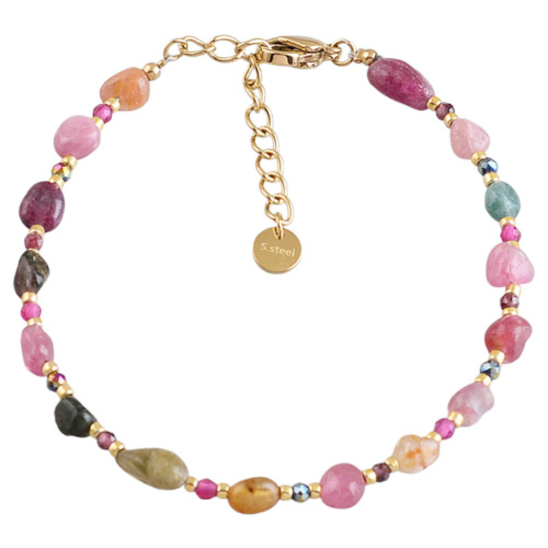Naturstein Armband Stahl vergoldet bunt rosa, rot, grün, gold 19 cm